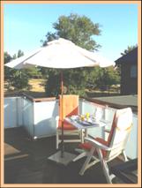 Ausstattung Wohnraum mit Polstersofa, Sitzgruppe und Miniküche mit Kühlschrank, Spüle). Schlafraum mit franz. Polsterbett. Modernes Duschbad mit WC. Terrassen mit Tisch, 4 Stühlen und Sonnenschirm.