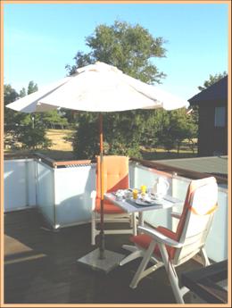 Ausstattung Wohnraum mit Ledersofa, Sitzgruppe und Pantry mit Kühlschrank, Spüle, Filterkaffeemaschine, Eierkocher und Toaster. Schlafraum mit Boxspringbett. Separates Duschbad mit WC. Großer Balkon mit Tisch, 2 Stühlen und Sonnenschirm. Beistell–Kinderbett ist möglich. Equipment Livingroom with sofa, small dining table and pantry with fridge, rinse, Filter coffee machine, Egg cooker and Toaster. Sleeping-room with queen-size bed. Modern shower with toilet. Large balcony with table, two chairs and sun shade. Small Children bed is available. |